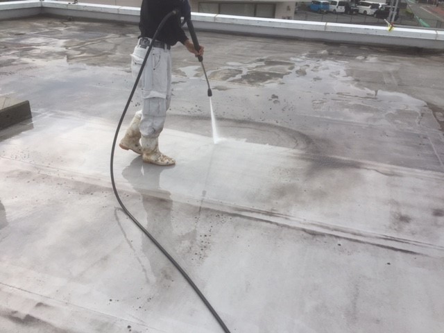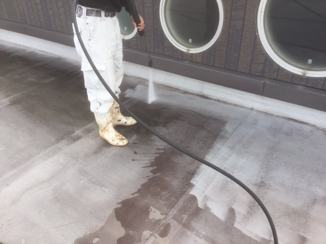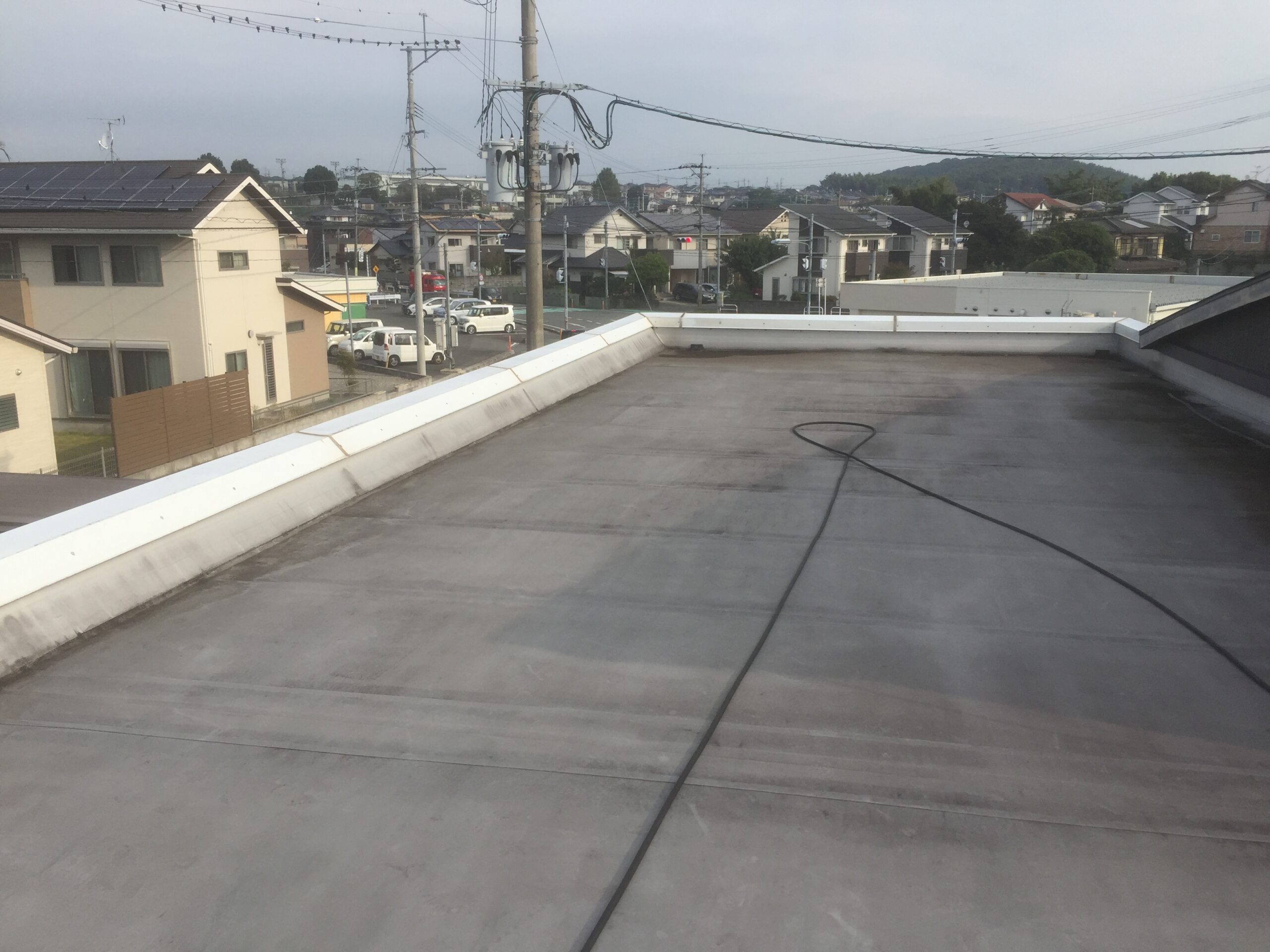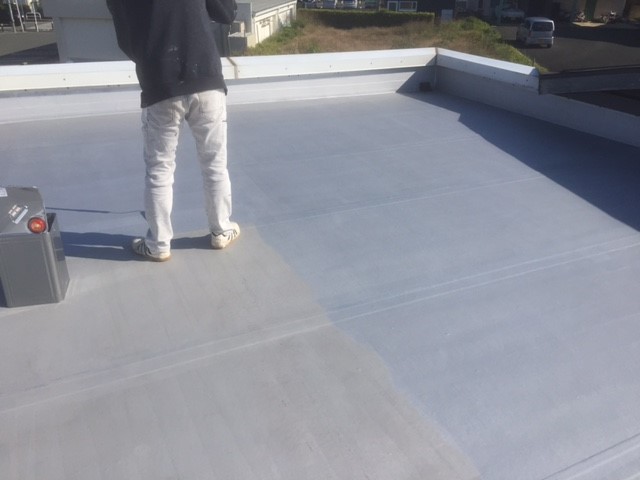 G.O保育園施工前の屋上です。屋上のコケなどの汚れをきれいに洗っている所です。保護塗料1回目塗布。保護塗料の2回目。屋上の保護塗料塗布工事完了。きれいになりました。   定期的に保護塗料を塗り替えれば防水シートの劣化をおさえ長持ちさせる事ができます。